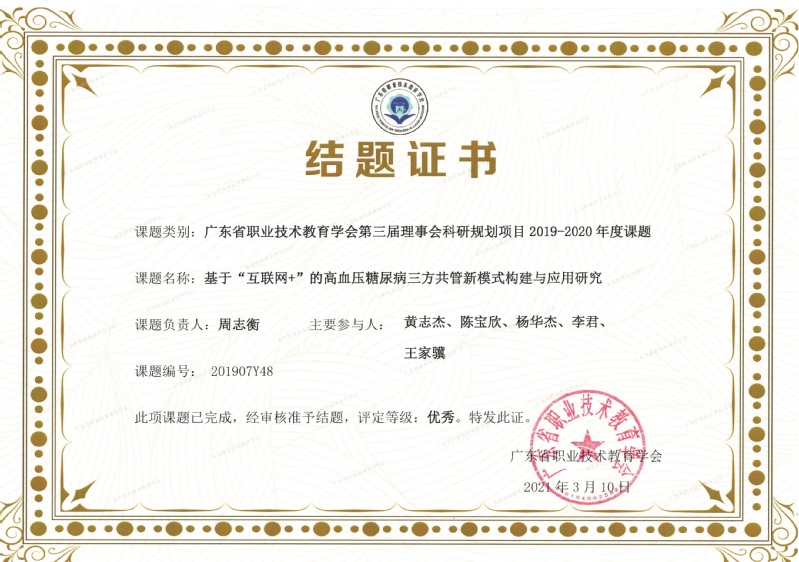 根據(jù)《廣東省職業(yè)技術(shù)教育學(xué)會(huì)第三屆理事會(huì)科研規(guī)劃項(xiàng)目2019-2020年度課題結(jié)題的通知》廣東省職業(yè)技術(shù)教育學(xué)會(huì)聘請專家結(jié)結(jié)題項(xiàng)目進(jìn)行了認(rèn)真評(píng)審,高職學(xué)院共83項(xiàng)課題順利結(jié)題。其中我校周志衡老師的課題《基于“互聯(lián)網(wǎng)+”的高血壓糖尿病三方共管新模式構(gòu)建與應(yīng)用研究》、王秀麗老師的課題《基于AI技術(shù)的大學(xué)英語“微課”的個(gè)性化設(shè)計(jì)與應(yīng)用研究》、王慶海老師的課題《關(guān)于體育美育課對(duì)高職院校中大學(xué)生人文素養(yǎng)提升的探究》、張哲老師的課題《非物質(zhì)文化遺產(chǎn)中粵繡的傳統(tǒng)圖形在現(xiàn)代設(shè)計(jì)中的傳承與應(yīng)用》等順利通過廣東省職業(yè)技術(shù)教育學(xué)會(huì)的結(jié)題評(píng)審,尤其是周志衡老師的課題結(jié)題評(píng)審結(jié)題為優(yōu)秀課題,具體名單見附件通知。