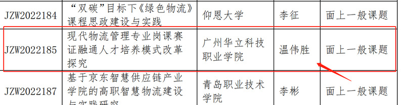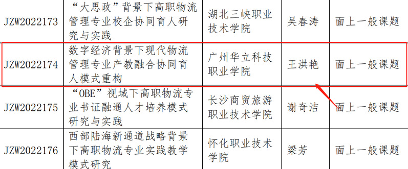 根據(jù)《關于申報2022年全國高校、職業(yè)院校物流教改教研課題的通知》(物學字〔2022〕5號),中國物流學會、教育部高等學校物流管理與工程類專業(yè)教學指導委員會和全國物流職業(yè)教育教學指導委員會共同研究啟動了2022年全國高校、職業(yè)院校物流教改教研課題申報工作。本次申報選題涉及物流行業(yè)發(fā)展與區(qū)域人才需求、物流專業(yè)數(shù)字化轉(zhuǎn)型、課程思政建設、教學改革、創(chuàng)新創(chuàng)業(yè)、產(chǎn)教融合與校企合作、師資隊伍建設、課程與資源建設、教學評價體系構建與研究、1+X證書制度試點等方面。經(jīng)自主申報、資格審查、專家評審、綜合評議等程序,最終決定366項課題(其中培育課題15項,面上課題351項)列入“2022年全國高校、職業(yè)院校物流教改教研課題計劃名單”。其中我校王洪艷老師的課題《數(shù)字經(jīng)濟背景下現(xiàn)代物流管理專業(yè)產(chǎn)教融合協(xié)同育人模式重構》和溫偉勝老師的課題《現(xiàn)代物流管理專業(yè)崗課賽證融通人才培養(yǎng)模式改革探究》順利入選。
