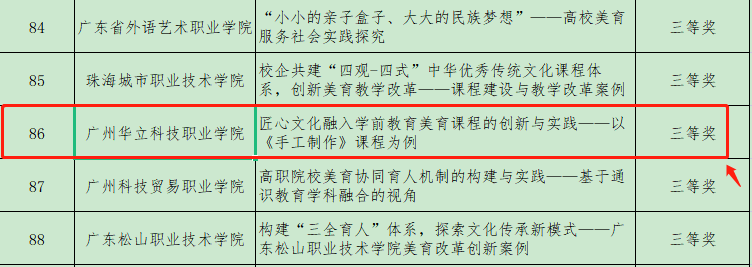 此次獲獎(jiǎng)名單分本科組及專科組,我校申報(bào)的美育案例《匠心文化融入學(xué)前教育美育課程的創(chuàng)新與實(shí)踐——以<手工制作>課程為例》獲得??平M三等獎(jiǎng)。