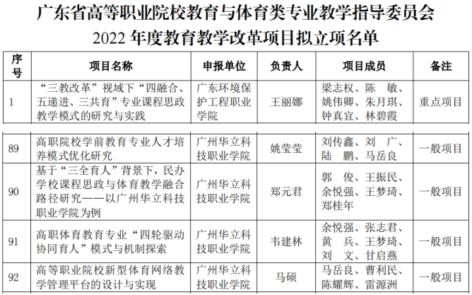 廣東省高等職業(yè)院校教育與體育類專業(yè)教學(xué)指導(dǎo)委員會(huì)今年10月份啟動(dòng)了2022年度教學(xué)改革項(xiàng)目的申報(bào)工作,經(jīng)各高職院校自主申報(bào)、形式審查、專家評(píng)審等程序,現(xiàn)予以公示。根據(jù)《關(guān)于組織申報(bào)2022年度教育與體育類專業(yè)教育教學(xué)改革項(xiàng)目的通知》(粵高職教育與體育教指委〔2022〕2號(hào))等文件,我校姚瑩瑩、鄭元君、韋建林、馬碩四位老師的項(xiàng)目獲立項(xiàng)建設(shè)。