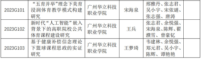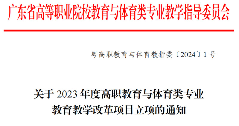 日前,從廣東省高等職業(yè)院校教育與體育類專業(yè)教學指導委員會文件《關(guān)于2023年高職教育與體育類專業(yè)教育教學改革項目立項的通知》(粵高職教育與體育教指委〔2024〕1號)獲悉,我校推薦申報的3項課題《“五育并舉”理念下美育浸潤體育教學模式構(gòu)建研究》(主持人:宋海泉)《新時代“人工智能”嵌入背景下的高職院校公共體育課程建設(shè)研究》(主持人:王兵)《基于健康補償信念理論下籃球課程思政的實證研究》(主持人:王夢琦)作為2023年高職教育與體育類專業(yè)教育教學改革項目立項。具體名單如下: