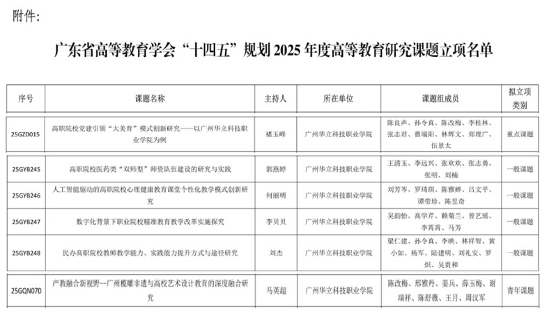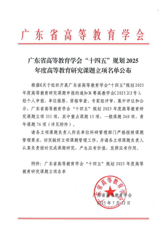 2025年7月12日,《廣東省高等教育學(xué)會(huì)“十四五”規(guī)劃2025年度高等教育研究課題擬立項(xiàng)名單公示》發(fā)布,我校獲得6項(xiàng)立項(xiàng),其中,重點(diǎn)課題1項(xiàng),一般課題5項(xiàng),青年課題1項(xiàng)。