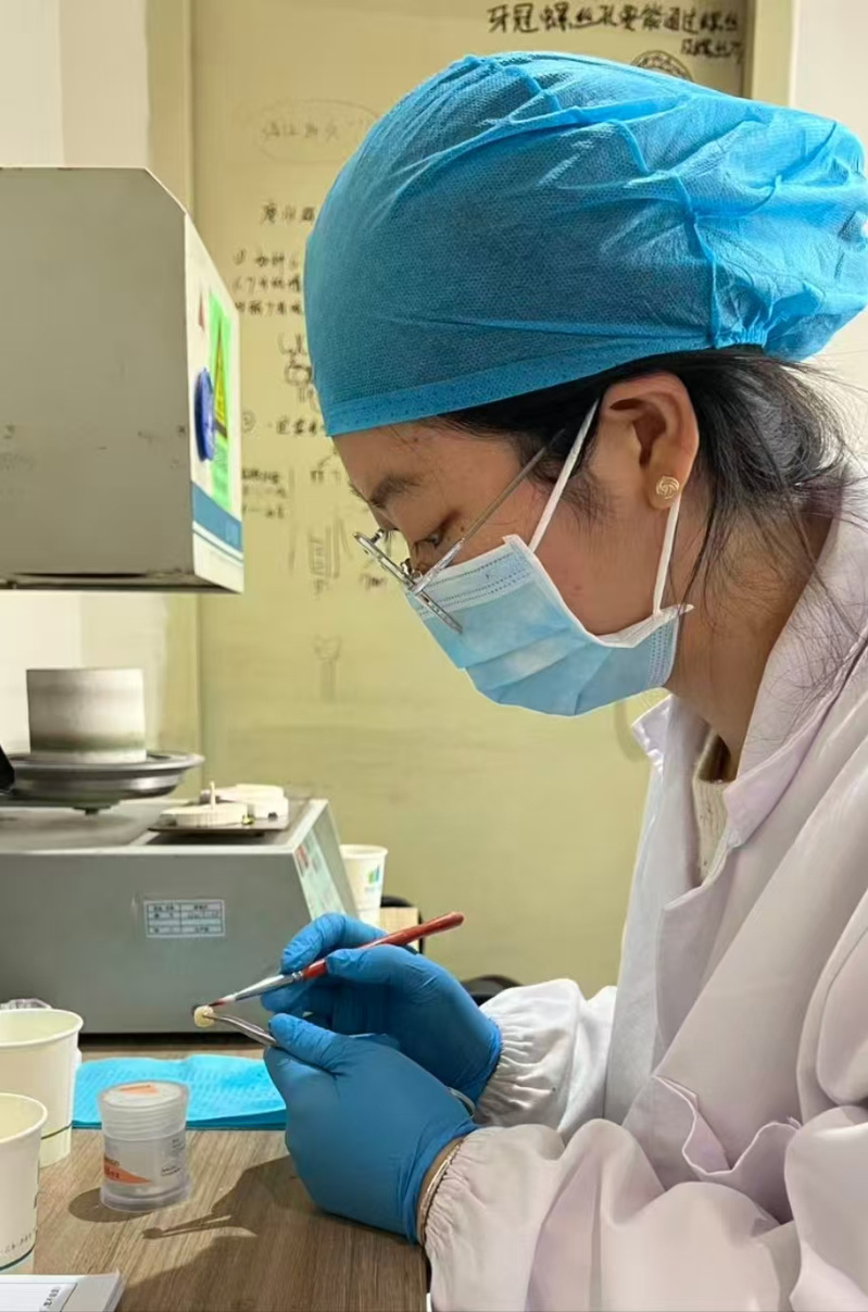 帶教老師評價:“祝英姿是我見過最具‘匠人精神’的椅旁技師。她對每個修復體的處理都非常仔細,例如在為一例四環(huán)素牙患者制作貼面時,她通過反復比色和分層染色,最終實現(xiàn)了與鄰牙色階的完美過渡。這種對技術(shù)極致的追求,值得所有年輕技師學習?!?/span>