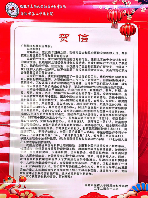 2025年1月14日,我院收到來自安徽中醫(yī)藥大學(xué)附屬太和中醫(yī)院的一封賀信。字里行間中表達(dá)了在過去的一年里,健康學(xué)院向安徽中醫(yī)藥大學(xué)附屬太和中醫(yī)院輸送了大量?jī)?yōu)秀實(shí)習(xí)生,不僅為安徽中醫(yī)藥大學(xué)附屬太和中醫(yī)院的醫(yī)療工作注入了活力,也贏得了患者和家屬的廣泛贊譽(yù)。