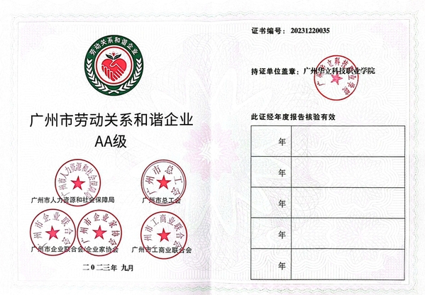 近日,經(jīng)廣州市人力資源和社會(huì)保障局、廣州市總工會(huì)、廣州市企業(yè)聯(lián)合會(huì)/企業(yè)家協(xié)會(huì)、廣州市工商業(yè)聯(lián)合會(huì)初審、復(fù)審和公示,我校獲評(píng)2023年度“廣州市勞動(dòng)關(guān)系和諧企業(yè)AA級(jí)”稱號(hào)。這是我校首次取得該項(xiàng)榮譽(yù),體現(xiàn)評(píng)審機(jī)構(gòu)對(duì)我校依法治校、依法保障員工利益、構(gòu)建和發(fā)展和諧勞動(dòng)關(guān)系等方面工作的充分肯定。