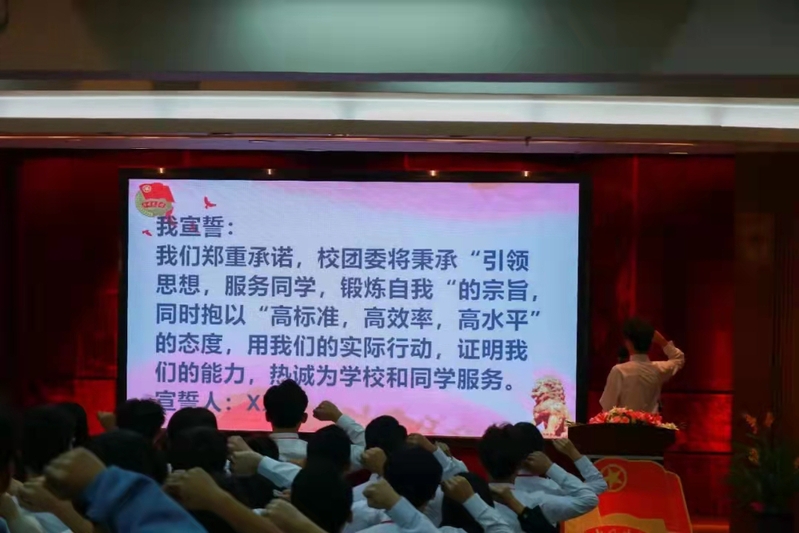 接著校團(tuán)委書記處副書記翁澤樺同學(xué)上臺(tái)發(fā)言,他表示將秉承“引領(lǐng)思想、服務(wù)同學(xué)、鍛煉自我”的宗旨,要以負(fù)責(zé)任的態(tài)度對(duì)待各項(xiàng)工作,從嚴(yán)要求自己,共同為學(xué)校的發(fā)展作建設(shè),隨后他帶領(lǐng)全體團(tuán)委成員進(jìn)行宣誓。