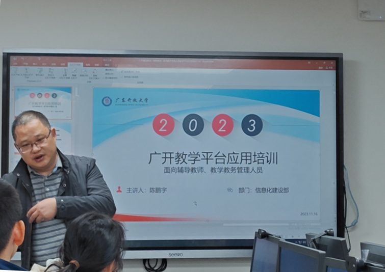 在培訓(xùn)會(huì)議中,廣開(kāi)信息建設(shè)部陳鵬宇老師給各校外教學(xué)點(diǎn)的老師演示教學(xué)平臺(tái)的基本功能與使用指南、教務(wù)管理端用戶(hù)注冊(cè)與輔導(dǎo)教師授權(quán)等功能的操作,并解答參加培訓(xùn)的各校外教學(xué)點(diǎn)老師提出的相關(guān)問(wèn)題。