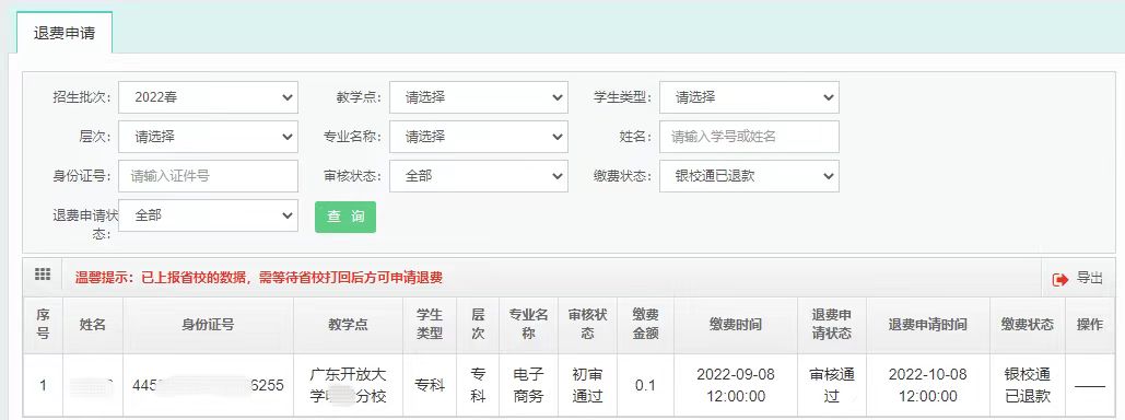 省校招生與合作部審核通過(guò)后,狀態(tài)為“提交銀校通退款”;之后由省校財(cái)務(wù)部進(jìn)行審批,狀態(tài)為“銀校通退款中”;銀校通執(zhí)行退款操作,退款成功后,狀態(tài)為“銀校通已退款”。