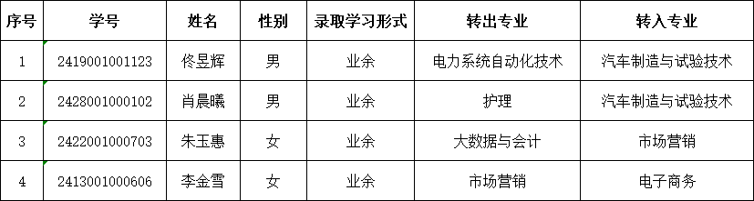根據(jù)我校《成人高等教育學(xué)生學(xué)籍管理規(guī)定》,由學(xué)生本人申請(qǐng),現(xiàn)有李金雪等4名同學(xué)遞交了轉(zhuǎn)專業(yè)申請(qǐng),經(jīng)繼續(xù)教育學(xué)院初步審核及學(xué)校學(xué)術(shù)委員會(huì)專家審議,擬同意李金雪等4名學(xué)生的轉(zhuǎn)專業(yè)申請(qǐng)。現(xiàn)將這些同學(xué)的轉(zhuǎn)專業(yè)信息進(jìn)行公示(見下表),公示期時(shí)間從2024年6月28日起至2024年7月5日止。