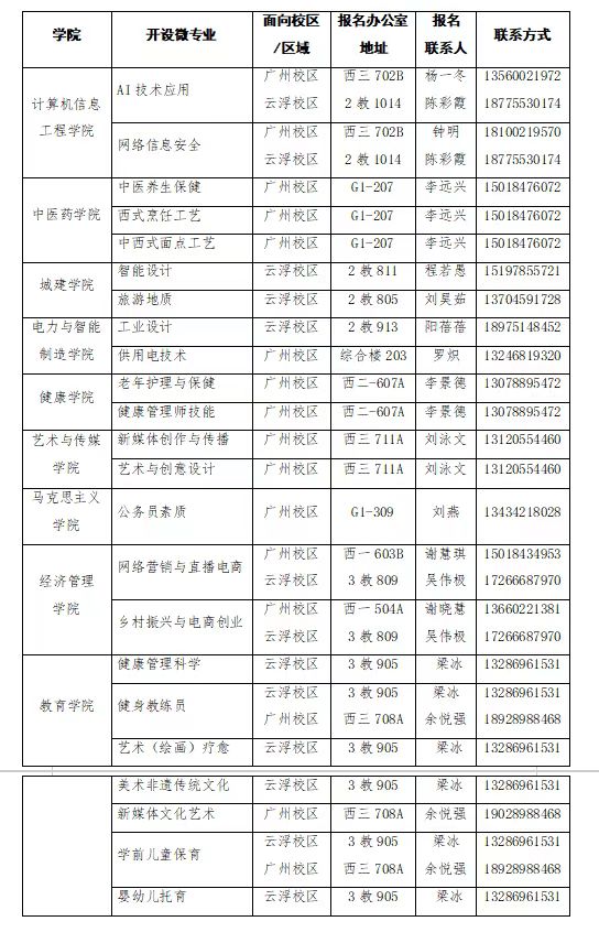 10月19—20日,微專(zhuān)業(yè)開(kāi)設(shè)學(xué)院對(duì)報(bào)名學(xué)生進(jìn)行審核,確定擬錄取名單。各學(xué)院按照招生專(zhuān)業(yè)分別填寫(xiě)《廣州華立科技職業(yè)學(xué)院微專(zhuān)業(yè)報(bào)名匯總表》(附件2)