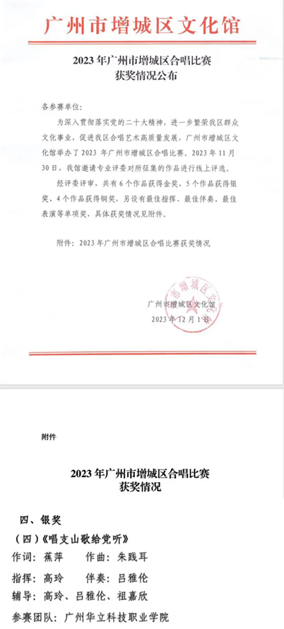 2023年12月,教育學(xué)院合唱團(tuán)在廣州市增城區(qū)文化館舉辦的2023年廣州市增城區(qū)合唱比賽中榮獲銀獎(jiǎng)。