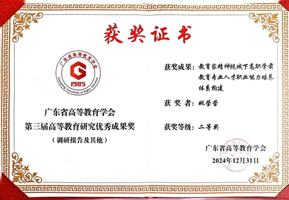 學(xué)院姚瑩瑩老師憑借研究成果《教育家精神視域下高職學(xué)前教育專(zhuān)業(yè)人才職業(yè)能力培養(yǎng)體系構(gòu)建》榮獲第三屆高等教育研究?jī)?yōu)秀成果二等獎(jiǎng)。該評(píng)選作為省內(nèi)高等教育研究領(lǐng)域的重要賽事,每?jī)赡昱e辦一屆,歷經(jīng)個(gè)人申報(bào)、單位推薦、專(zhuān)家評(píng)審等嚴(yán)格程序,其公正性與權(quán)威性備受學(xué)界認(rèn)可。姚老師的研究成果從多維視角系統(tǒng)構(gòu)建了新時(shí)代背景下教育家精神引領(lǐng)高職院校學(xué)前教育專(zhuān)業(yè)人才職業(yè)能力培養(yǎng)發(fā)展路徑,進(jìn)一步完善育人工作體系,不斷增強(qiáng)職業(yè)教育育人實(shí)效提供了實(shí)踐路徑,研究成果為學(xué)前教育專(zhuān)業(yè)高質(zhì)量特色發(fā)展提供了具有針對(duì)性的實(shí)踐路徑,實(shí)施成效顯著。