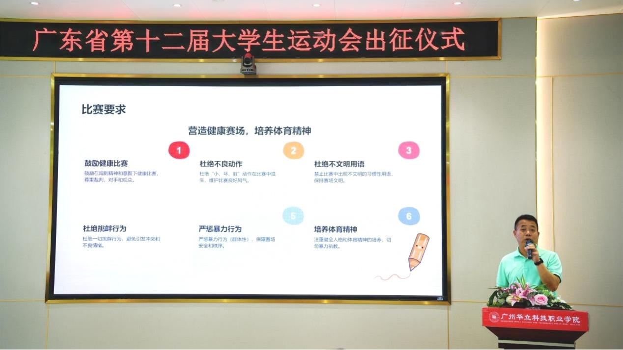 為推動我校體育事業(yè)邁向高質(zhì)量發(fā)展新征程,凝聚人心、提振精神,5月8日上午,廣州華立科技職業(yè)學(xué)院廣州校區(qū)和云浮校區(qū)同步舉行廣東省第十二屆大學(xué)生運(yùn)動會出征儀式。學(xué)校黨委委員宋海泉、校團(tuán)委書記張超越、教育學(xué)院院長馬岳良、教育學(xué)院副院長朱君;各運(yùn)動隊領(lǐng)隊、教練員、運(yùn)動員以及工作人員共同出席活動,為運(yùn)動健兒鼓舞士氣,凝聚團(tuán)隊力量。