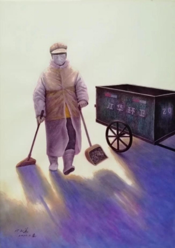疫情當(dāng)前的一個(gè)早晨,正在清潔打掃的環(huán)衛(wèi)工人堅(jiān)守在普通的勞動(dòng)崗位。畫(huà)家平實(shí)而細(xì)致地描繪了這個(gè)場(chǎng)景。