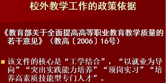 會上,居振宇老師介紹了校外教學(xué)工作的政策依據(jù),并強調(diào)所有教師都應(yīng)認(rèn)真學(xué)習(xí)《教育部關(guān)于全面提高高等職業(yè)教育教學(xué)質(zhì)量的若干意見》(教高【2006】16號)等相關(guān)文件精神,并仔細(xì)傳達(dá)到每位學(xué)生,最后落實到實際校外教學(xué)工作中。