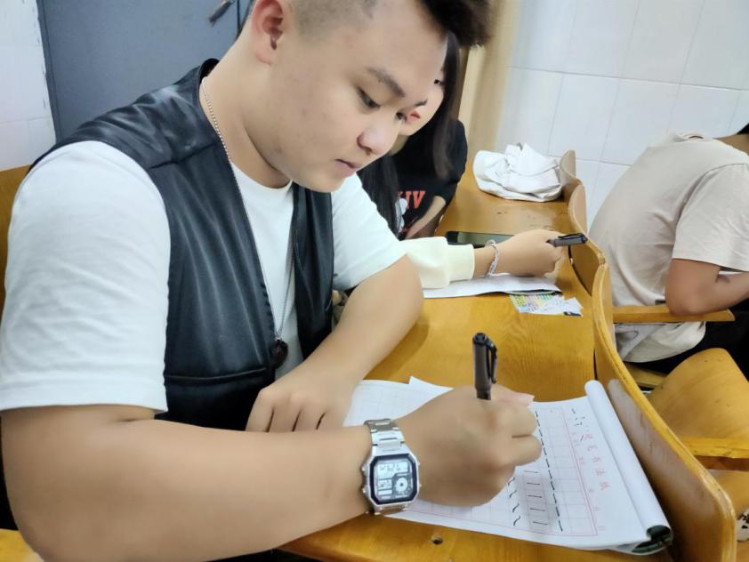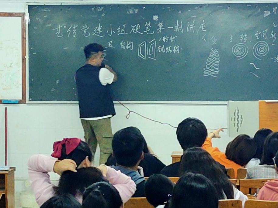 講座開始由張召能隊長教同學們基本筆畫,在黑板上親自示范詳細講述一個筆畫的開頭到結(jié)尾。想要練好書法,筆畫的書寫十分重要,除此之外對于控筆的要求也非常高。同學們在進行球類運動時會練出手臂的肌肉,這并不利于書法中的“軟”的展現(xiàn),但是隊長有妙招!通過練習畫類似于蚊香的曲線可以有效改善肌肉過硬的問題,從而達到更好的效果。字體的整體呈現(xiàn)還需要形狀、方向、大小的配合,這幾點缺一不可。
