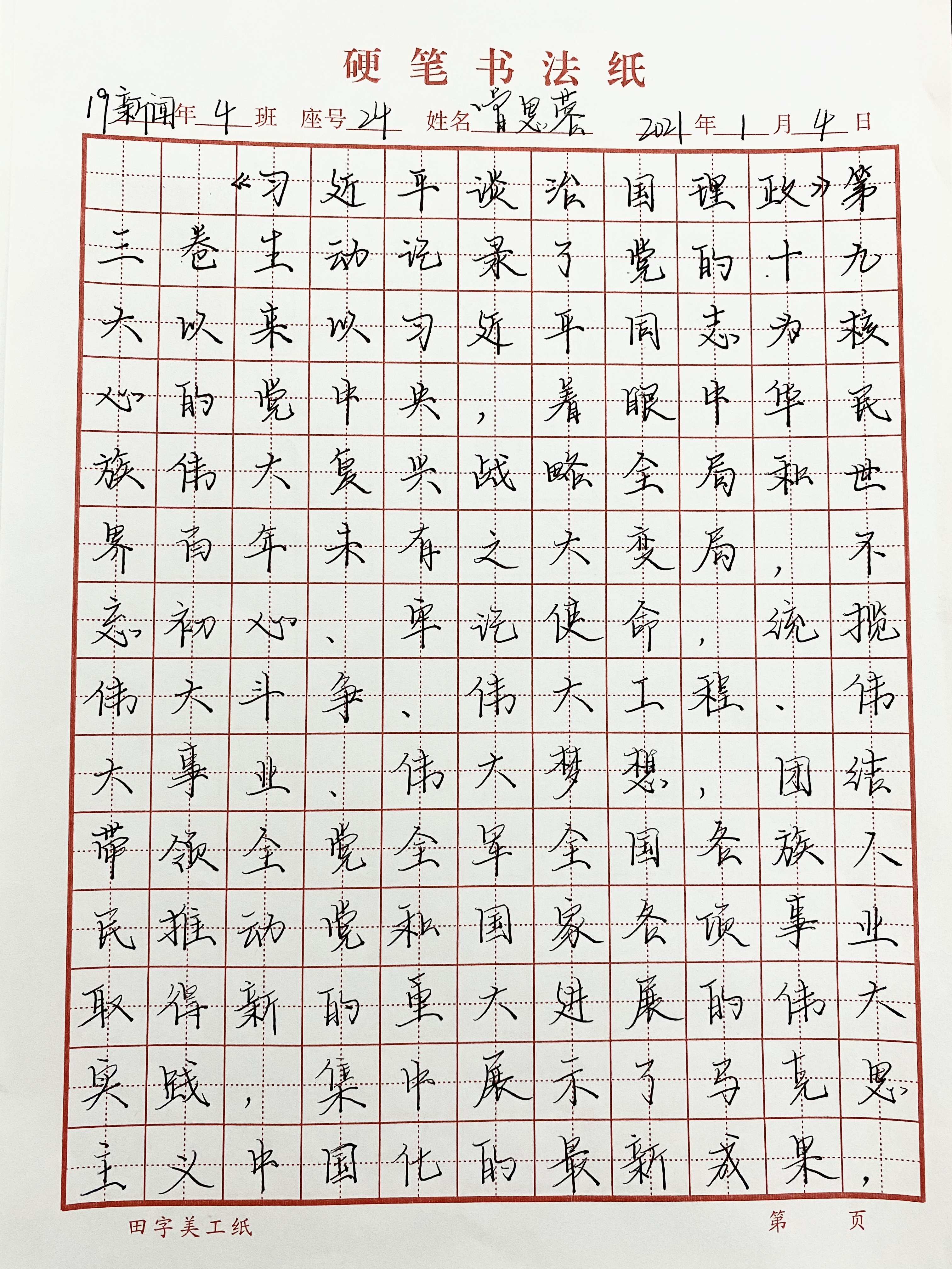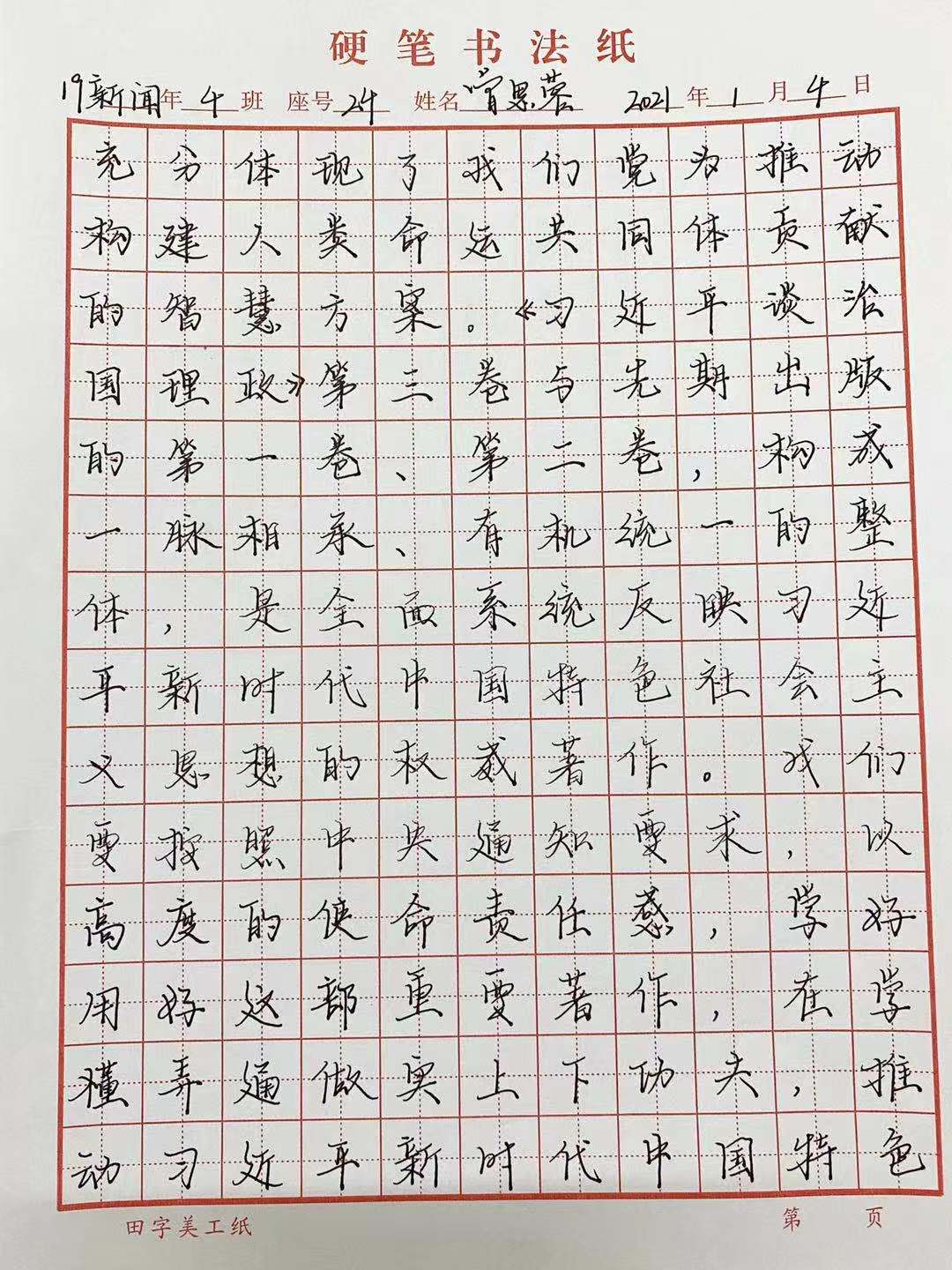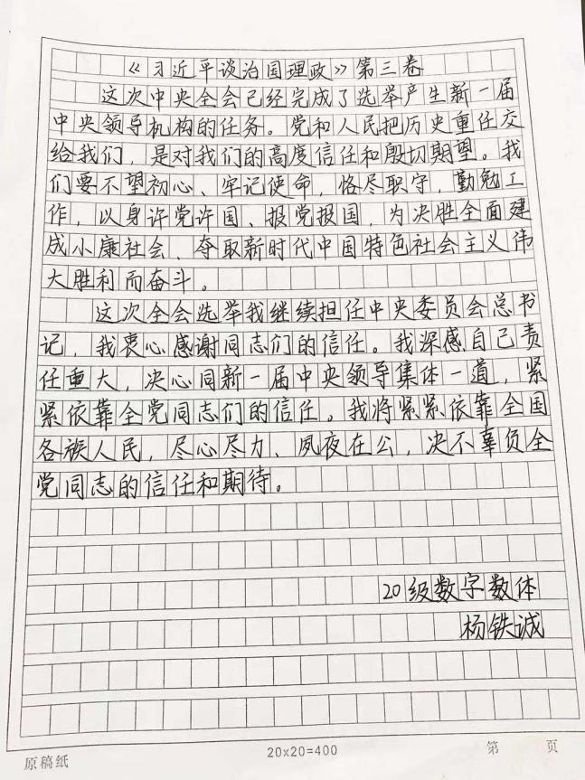 于2020年12月29日舉行藝術與傳媒學院第一屆硬筆書法比賽。為了幫助同學們更加深入領會掌握習近平新時代中國特色社會主義思想的科學體系,進一步增強學思想、悟思想、用思想的自覺性和堅定性,將《學習習近平談治國理政》第三卷的內容作為比賽的內容。