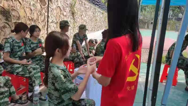在訓(xùn)練的中場(chǎng)休息時(shí)間,黨建小組成員為新生們派送清涼的礦泉水,為軍訓(xùn)中的新生帶來一絲涼意。為深入了解新生生活情況,促進(jìn)新生更好的融入集體環(huán)境,黨建小組成員在和新生的交流過程中,了解到了新生的興趣愛好、飲食和休息時(shí)間,同時(shí)也向新生們介紹校園各區(qū)域的功能使用方法。