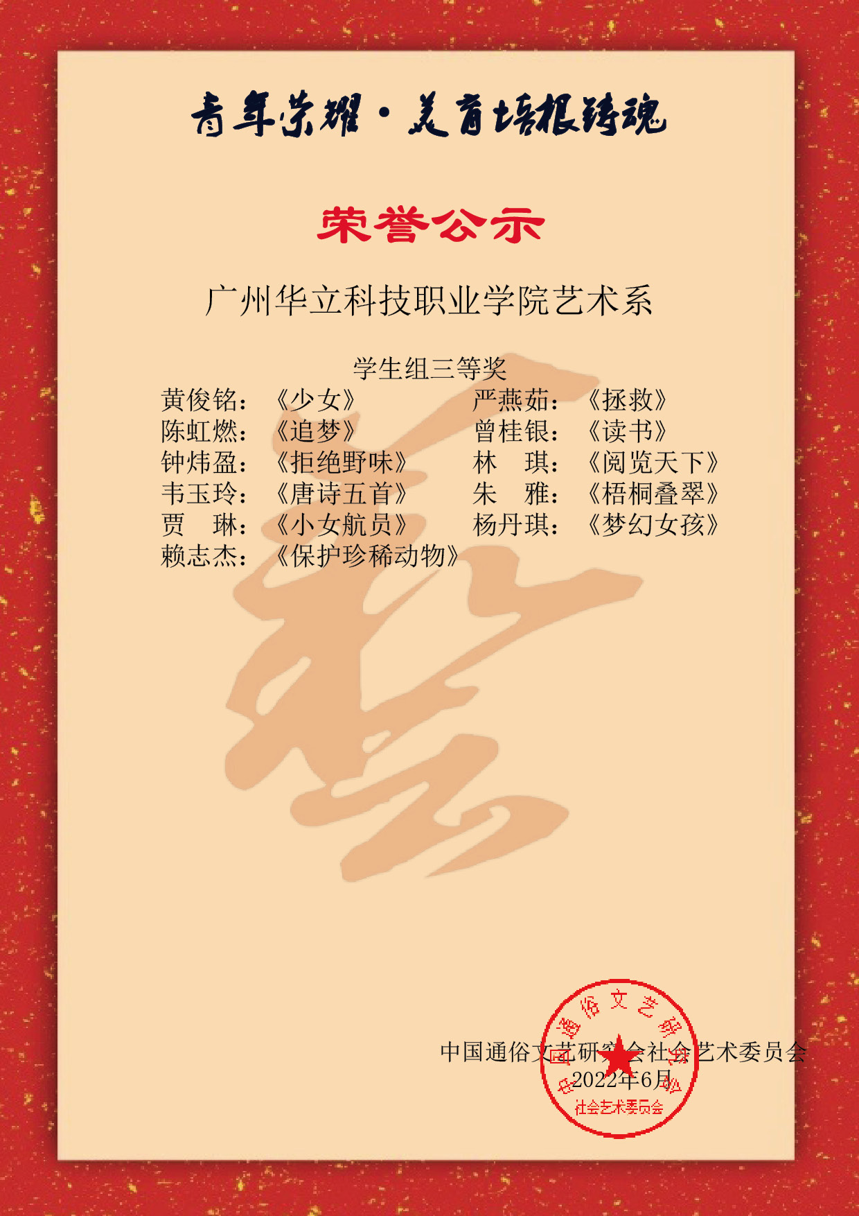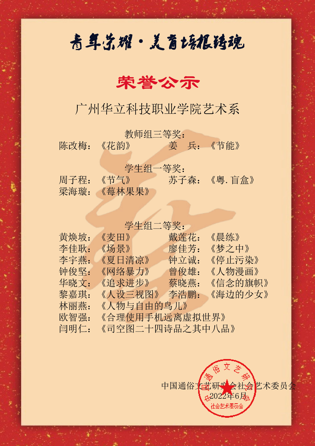 由中國(guó)通俗文藝研究會(huì)藝術(shù)委員會(huì)舉辦的第二屆全國(guó)“青年榮耀.美育培根鑄魂”青少年藝術(shù)成果展演比賽活動(dòng)中,我院教師、學(xué)生獲得優(yōu)異成績(jī),在這次大賽活動(dòng)中,我院鄧常寧、李桂林、邢雅丹、黎映如、姜兵、陳改梅、陳舒薇老師獲得優(yōu)秀指導(dǎo)老師獎(jiǎng),以上老師分別榮獲教師組一、二、三等獎(jiǎng)。我院29名學(xué)生獲得優(yōu)異成績(jī)。