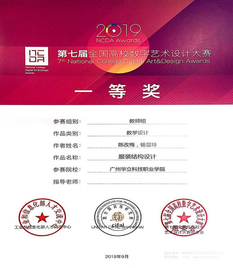 2019年陳改梅,楊雪玲老師的服裝結(jié)構(gòu)設計作品榮獲第七屆全國高校數(shù)字藝術設計大賽一等獎