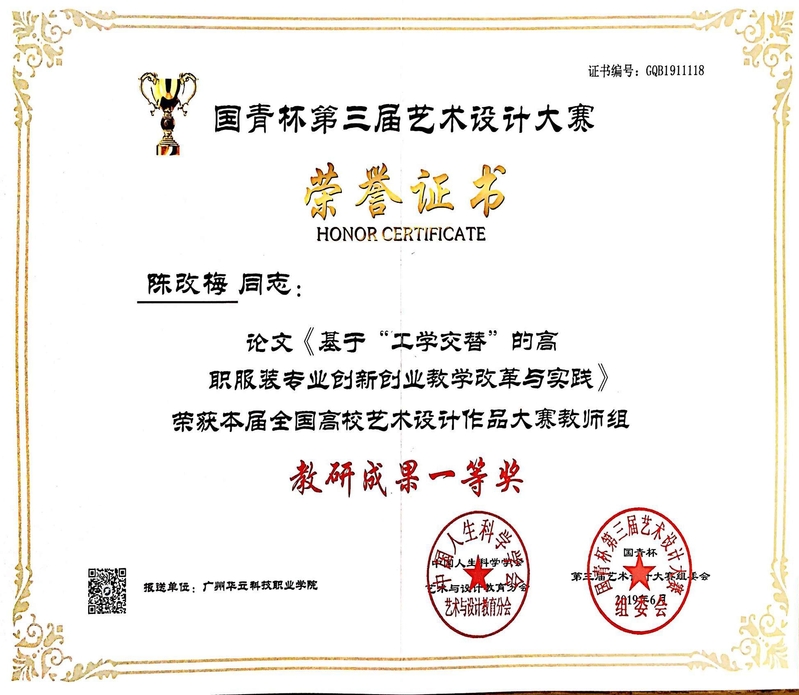 2019年陳改梅老師榮獲國青杯第三屆全國高校藝術(shù)設(shè)計大賽《基于“工學(xué)交替”的高職服裝專業(yè)創(chuàng)新創(chuàng)業(yè)教學(xué)改革與實踐》教研成果一等獎