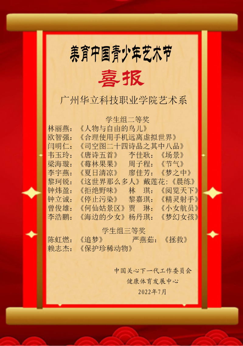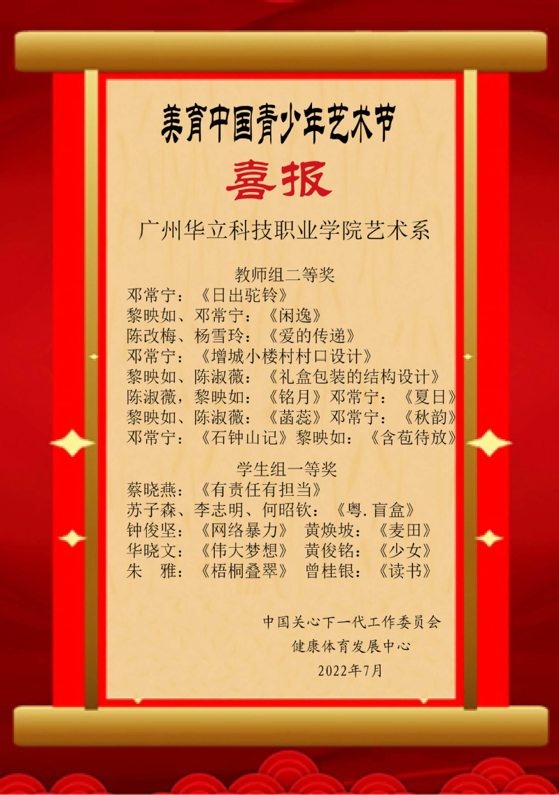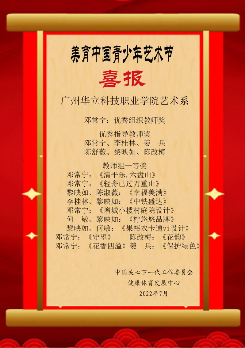 由中國(guó)關(guān)心下一代工作委員會(huì)舉辦的全國(guó)“美育青少年藝術(shù)節(jié)高校作品大賽”比賽活動(dòng)中,我院師生獲得優(yōu)異成績(jī)。在本次大賽活動(dòng)中,我院陳改梅、鄧常寧、李桂林、黎映如、姜兵、陳舒薇老師獲得優(yōu)秀指導(dǎo)老師獎(jiǎng),鄧常寧老師獲得優(yōu)秀組織獎(jiǎng)。以上老師分別榮獲教師組一、二等獎(jiǎng),我院有25名學(xué)生獲得優(yōu)異成績(jī)。