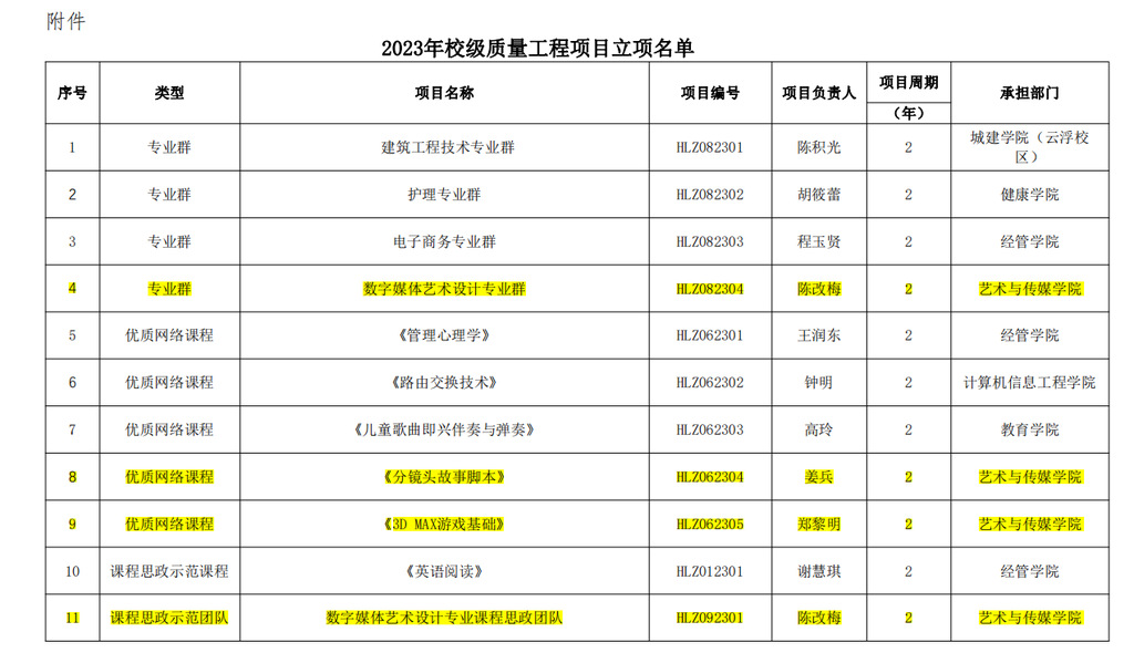 根據(jù)《關(guān)于組織開(kāi)展2023年校級(jí)職業(yè)教育教學(xué)質(zhì)量與教學(xué)改革工程項(xiàng)目申報(bào)的通知》(華立職院〔2023〕93號(hào) ),經(jīng)教師個(gè)人申報(bào)、二級(jí)學(xué)院和系部推薦、教務(wù)處形式審查、專家評(píng)審、校內(nèi)公示等環(huán)節(jié),現(xiàn)將2023年校級(jí)高等職業(yè)教育教學(xué)質(zhì)量與教學(xué)改革工程(以下簡(jiǎn)稱“校質(zhì)量工程”)項(xiàng)目立項(xiàng)名單予以公布(附件1)。