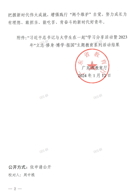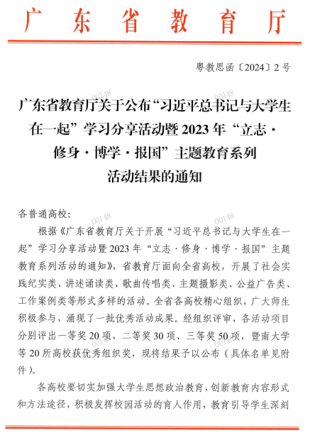 近日,廣東省教育廳發(fā)布《關于“習近平總書記與大學生在一起”學習分享活動暨2023年“立志·修身·博學·報國”主題教育系列活動結果的通知》,我院師生共3項作品獲獎,二等獎2項、三等獎1項。據(jù)悉,2份作品被省教育廳推薦參評第七屆全國網(wǎng)絡文化節(jié)。