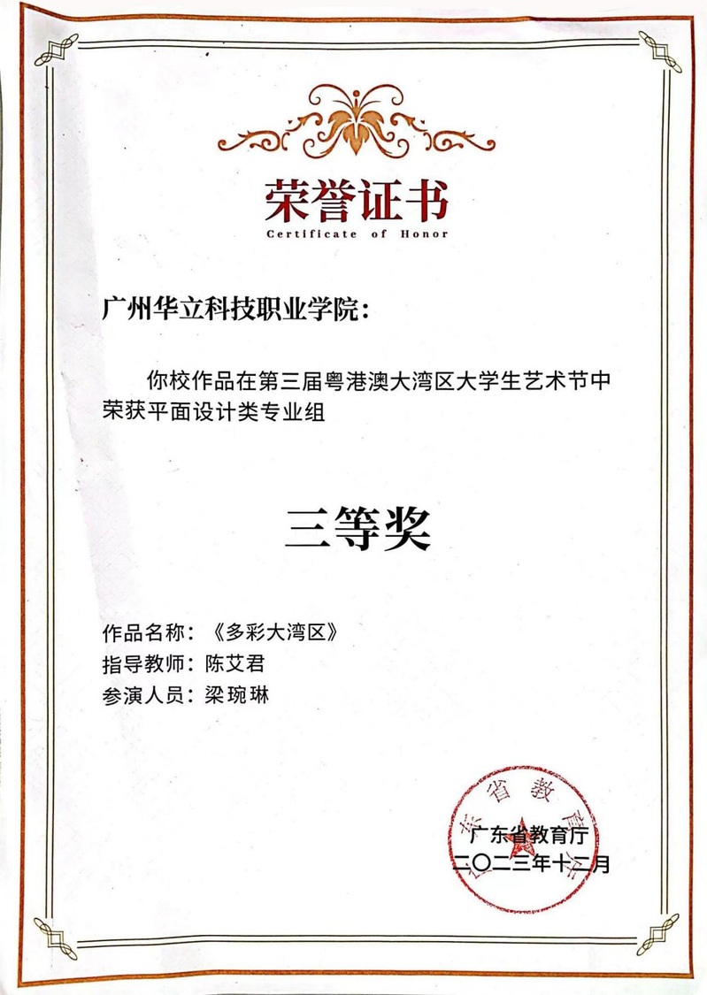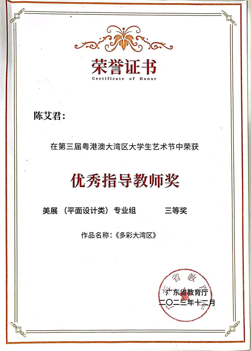 2023年11月25日,廣東省教育廳公布了第三屆粵港澳大灣區(qū)大學生藝術節(jié)獲獎名單,并在南方科技大學落下帷幕。近日,收到藝術與傳媒學院教師陳艾君指導的22級視傳1班學生梁琬琳的作品《多彩大灣區(qū)》榮獲平面設計類專業(yè)組三等獎獲獎證書!作品以初評、復評的方式重重篩選,最終成功入選并獲得獎項,此次的展覽具有相當高的專業(yè)難度,是大學生之間相互促進和交流的一次成果匯報。