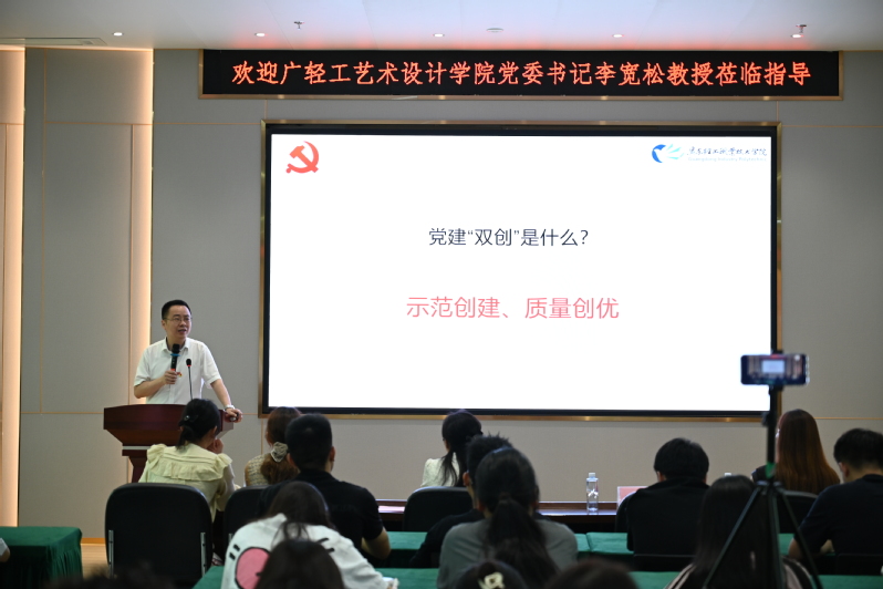 會上,李寬松書記簡要介紹了廣東輕工職業(yè)技術(shù)學院的基本情況、黨建工作開展情況及取得的成果,重點圍繞“樣板黨支部”“標桿院系”和“雙帶頭人支部書記工作室”等的創(chuàng)建立項,推動藝術(shù)設(shè)計學院“雙高”和“雙創(chuàng)”建設(shè)融合發(fā)展進行了詳細的介紹,解讀《條例》,強調(diào)要著力構(gòu)建“黨建+學院發(fā)展”、“黨建+專業(yè)建設(shè)”、“黨建+人才培養(yǎng)”的工作格局,將黨組織建設(shè)與職業(yè)教育事業(yè)發(fā)展深度融合、以高質(zhì)量黨建引領(lǐng)高質(zhì)量發(fā)展為主線,全力推動黨建工作各項任務高效落地、高標落實。