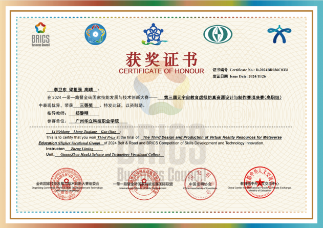 2024年11月15-17日,2024“一帶一路暨金磚國(guó)家技能發(fā)展與技術(shù)創(chuàng)新大賽·第三屆元宇宙教育虛擬仿真資源設(shè)計(jì)與制作”賽項(xiàng)全國(guó)決賽在廣州舉行,來(lái)自全國(guó)16個(gè)省、自治區(qū)、直轄市及新疆生產(chǎn)建設(shè)兵團(tuán)的77所學(xué)校的101支師生隊(duì)伍參加比賽,藝術(shù)與傳媒學(xué)院動(dòng)漫制作技術(shù)系主任鄭黎明老師指導(dǎo)的兩支參賽隊(duì)(李衛(wèi)東,梁祖強(qiáng),高晴;馬僖妍,紀(jì)怡雯,代羽曦)在為期三天的比賽中脫穎而出,獲得2項(xiàng)銅獎(jiǎng)。