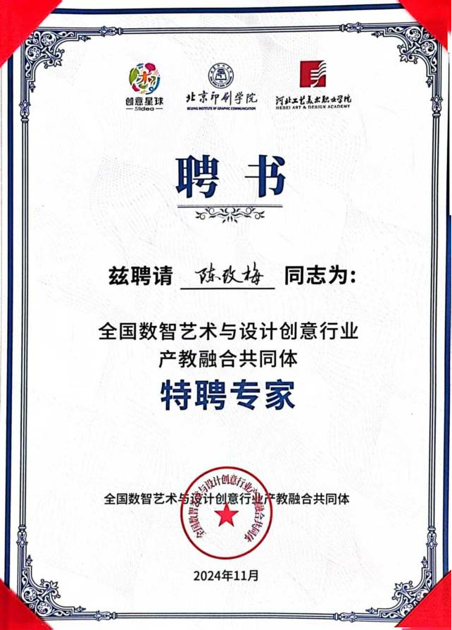此次加入全國數(shù)智藝術(shù)與設(shè)計創(chuàng)意行業(yè)產(chǎn)教融合共同體,是華立職院在藝術(shù)設(shè)計教育創(chuàng)新和產(chǎn)教融合方面邁出的重要一步。經(jīng)全國輕工藝術(shù)設(shè)計專業(yè)委員會和共同體專家評審:華立職院榮獲共同體“成員單位”,常務(wù)副校長馬俊、藝術(shù)與傳媒學(xué)院副院長陳改梅分別榮獲共同體“特聘專家”;華立職院常務(wù)副校長馬俊獲聘“全國輕工藝術(shù)設(shè)計專委會智庫專家”;華立職院常務(wù)副校長馬俊榮獲2024年度“職業(yè)教育產(chǎn)教融合代表人物”稱號、華立職院榮獲“產(chǎn)教融合典型案例”1項。