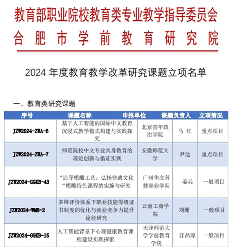近期,教育部職業(yè)院校教育類專業(yè)教學(xué)指導(dǎo)委員會(huì)《關(guān)于公布2024年度教育教學(xué)改革研究課題立項(xiàng)名單》的通知,我校藝術(shù)與傳媒學(xué)院教師姜兵老師申報(bào)的《“追尋欖雕工藝,弘揚(yáng)非遺文化”欖雕特色課程的實(shí)施與研究》課題成功立項(xiàng)。