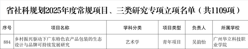 近日,廣東省社會(huì)科學(xué)界聯(lián)合會(huì)發(fā)布了《廣東省哲學(xué)社會(huì)科學(xué)規(guī)劃2025年度常規(guī)項(xiàng)目、三類研究專項(xiàng)擬立項(xiàng)名單》,我校藝術(shù)與傳媒學(xué)院吳韻怡副教授主持的項(xiàng)目《鄉(xiāng)村振興驅(qū)動(dòng)下廣東特色農(nóng)產(chǎn)品包裝的生態(tài)設(shè)計(jì)與品牌可持續(xù)發(fā)展研究》獲得青年項(xiàng)目立項(xiàng),實(shí)現(xiàn)了我校在青年項(xiàng)目類別零的突破。