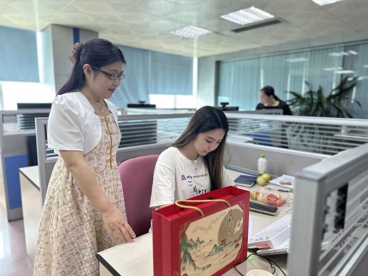 慰問期間,陳改梅書記與李雅琪同學(xué)進(jìn)行了親切交談,詳細(xì)了解了她在實習(xí)崗位上的工作內(nèi)容、生活狀況以及實習(xí)收獲。陳書記親手將代表團(tuán)圓和祝福的月餅禮盒送到李雅琪手中,對她能夠在中國電信這樣的大型國企穩(wěn)定實習(xí)、鍛煉自我表示了充分肯定。