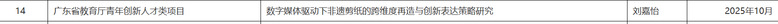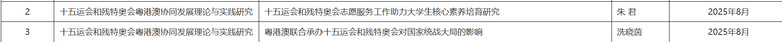 2025年8月,《十五運(yùn)會(huì)和殘?zhí)貖W會(huì)粵港澳協(xié)同發(fā)展理論與實(shí)踐研究項(xiàng)目》立項(xiàng)名單公布,學(xué)院朱君老師的《十五運(yùn)會(huì)志愿服務(wù)助力大學(xué)生核心素養(yǎng)培育研究》、冼曉茵老師的《粵港澳聯(lián)合辦賽對(duì)國(guó)家統(tǒng)戰(zhàn)大局的影響》兩項(xiàng)課題成功獲批。2025年10月,省教育廳青年創(chuàng)新人才類項(xiàng)目立項(xiàng)中,學(xué)院劉嘉怡老師的《數(shù)字媒體驅(qū)動(dòng)下非遺剪紙跨維度再造與創(chuàng)新表達(dá)研究》成功獲批。