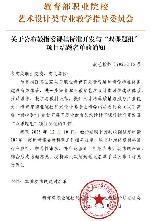 近日,教育部職業(yè)院校藝術(shù)設(shè)計(jì)類專業(yè)教學(xué)指導(dǎo)委員會(huì)正式公布課程標(biāo)準(zhǔn)開發(fā)與“雙課題組”項(xiàng)目結(jié)題名單。廣州華立科技職業(yè)學(xué)院藝術(shù)與傳媒學(xué)院申報(bào)的五項(xiàng)課題全部通過結(jié)題評審,展現(xiàn)了學(xué)校在職業(yè)教育藝術(shù)設(shè)計(jì)類專業(yè)建設(shè)中的扎實(shí)成果與創(chuàng)新活力。