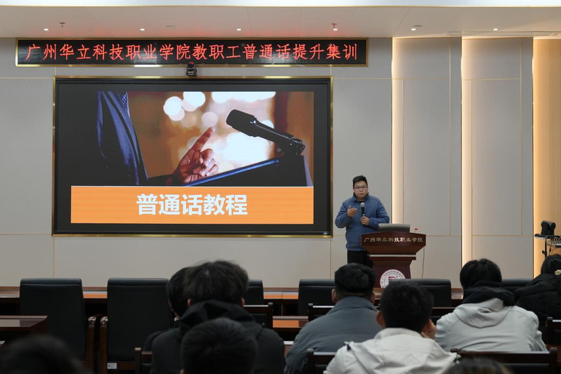 為提升教職工普通話應(yīng)用水平,強(qiáng)化教育教學(xué)語言規(guī)范,近日,廣州華立科技職業(yè)學(xué)院開展教職工普通話提升集訓(xùn)。學(xué)校人事處處長鐘文浩、藝術(shù)與傳媒學(xué)院院長朱君到場參會,全校各部門教職工積極參訓(xùn)。