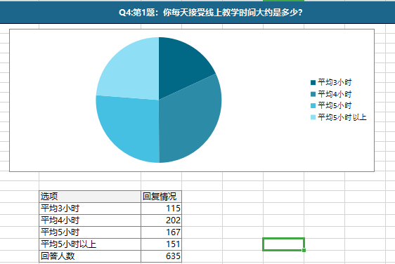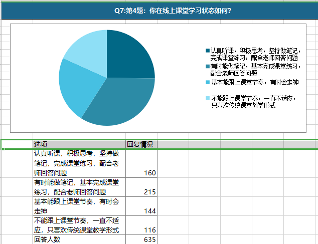 本次收回問(wèn)卷635份,問(wèn)卷顯示,大約一半的同學(xué)每天會(huì)花5個(gè)小時(shí)以上的時(shí)間用于網(wǎng)課學(xué)習(xí),學(xué)習(xí)主動(dòng)性較好,能跟上老師的節(jié)奏,認(rèn)真完成網(wǎng)絡(luò)課程學(xué)習(xí);學(xué)生認(rèn)為大部分的老師都能認(rèn)真進(jìn)行線上教學(xué),能及時(shí)對(duì)學(xué)生的問(wèn)題進(jìn)行答疑解惑,喜歡老師采用課堂直播與實(shí)時(shí)互動(dòng)的形式進(jìn)行,對(duì)大部分老師的教學(xué)比較滿意,但是,也有學(xué)生反映前期上課只有電子版教材、一小部分老師網(wǎng)絡(luò)平臺(tái)使用操作不熟練,上課互動(dòng)少等情況。