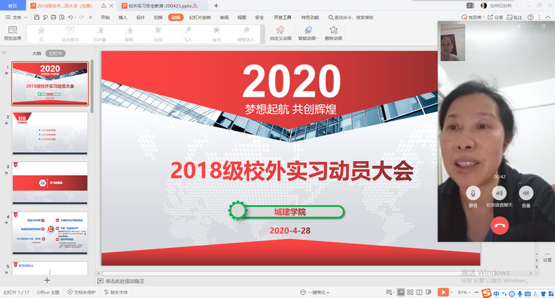 2020年4月28日晚上19:00-21:00,城建學(xué)院2018級學(xué)生校外實(shí)習(xí)動員大會在釘釘APP上通過直播的方式順利召開。參加大會的有學(xué)院常務(wù)副院長鄒筱萍、校外教學(xué)主任劉燕、學(xué)管主任林輝文,負(fù)責(zé)18級的校外實(shí)習(xí)指導(dǎo)和學(xué)生管理工作的各位老師們,以及2018級全體學(xué)生。同時我們還邀請了華立地產(chǎn)集團(tuán)行政辦陳月柔副經(jīng)理出席大會。