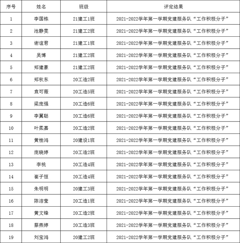 經(jīng)學(xué)生本人申請(qǐng),黨建小組評(píng)選推薦,學(xué)管辦公室2021年12月29日會(huì)議研究,確定了城建學(xué)院黨總支2021-2022學(xué)年第一學(xué)期黨建服務(wù)隊(duì)“工作積極分子”擬表彰名單。現(xiàn)將名單予以公示,公示期為12月29日-12月31日。