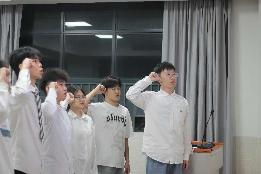 按照大會議程,進行完奏唱國歌、宣讀新團員名單后,10名新團員分別上臺進行發(fā)言。新團員發(fā)言完畢后,由團委書記楊威豪老師為新團員佩戴團徽并領著新團員進行入團宣誓。