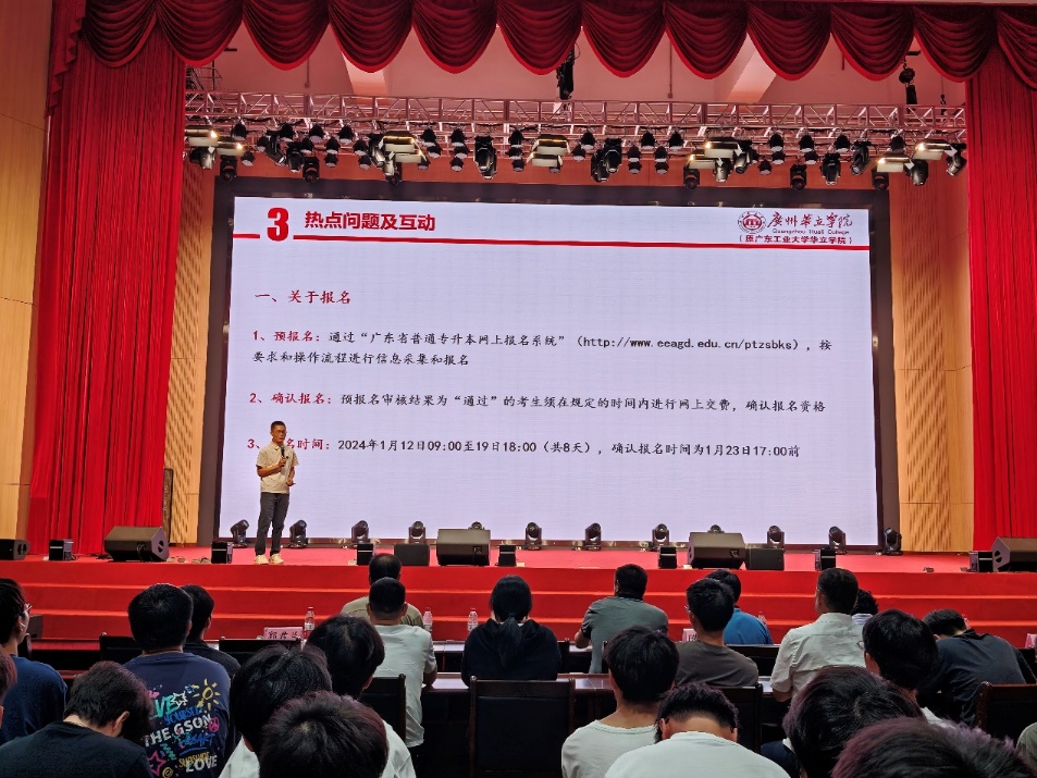 隨后,梁培群老師細(xì)致解讀專升本的最新政策,對專升本的報(bào)名條件、考試科目、錄取流程等關(guān)鍵環(huán)節(jié)進(jìn)行了逐一講解,引導(dǎo)同學(xué)們認(rèn)清專升本形勢,精準(zhǔn)合理定位。