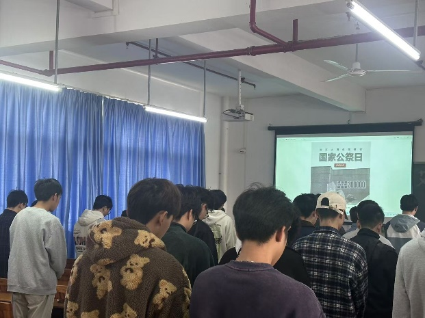 12月13日是南京大屠殺死難者國(guó)家公祭日。為悼念南京大屠殺死難者和所有慘遭日本侵略者殺戮的死難同胞,宣示牢記歷史、不忘過去、珍愛和平、開創(chuàng)未來的堅(jiān)定立場(chǎng),今天上午,我校城建學(xué)院以課堂上“默哀三分鐘”的形式,開展“南京大屠殺死難者國(guó)家公祭日”悼念活動(dòng)。課堂上師生共同起立默哀悼念。