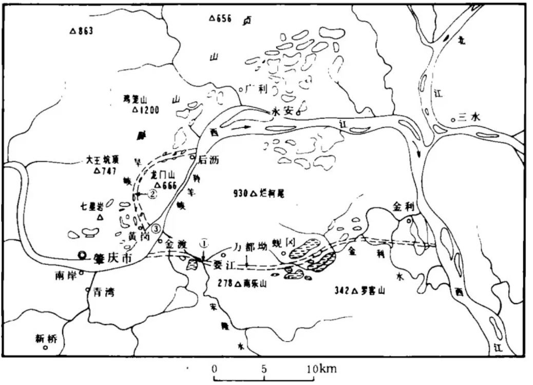 西江古河道與現(xiàn)河道圖(①——西江早期河道;②——西江中期河道;③——西江現(xiàn)河道)(吳繼遠,1993)