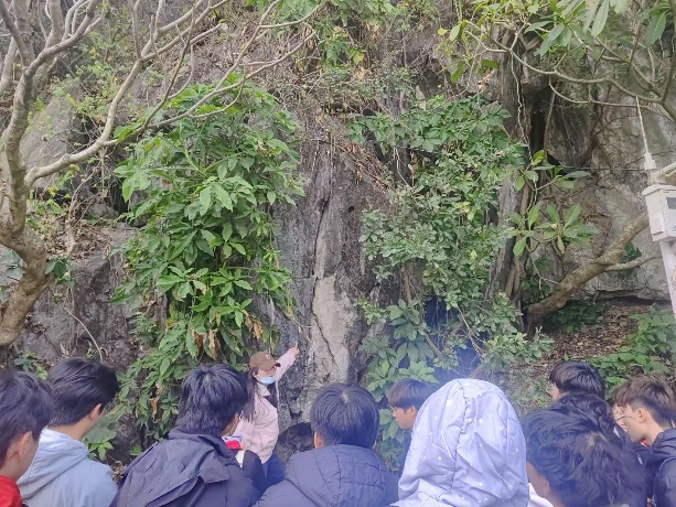 七星巖是開展地質(zhì)教學的理想場地,這里可以觀察到豐富的地質(zhì)構造、喀斯特地貌、流水地貌等。七星巖所在區(qū)域是北嶺背斜與羚羊峽背斜之間的向斜,在觀察巖層時,我們發(fā)現(xiàn)巖層有近似直立的背斜特征,推測為復向斜。由于肇慶地處亞熱帶,雨量多、氣溫高,侵蝕嚴重,尤其是流水侵蝕,灰?guī)r抗蝕力比較弱,在強烈的溶蝕作用下剝蝕了背斜核部,因此背斜被破壞,部分巖石受風化成土,最終土山出露和石山形成當?shù)氐桶牡匦?。再進一步受流水侵蝕,成排的背斜谷地兩側開始形成今天的七座石灰?guī)r山峰。結合區(qū)域地質(zhì)背景,石灰?guī)r下方應該是泥盆紀的砂巖或粉砂巖。