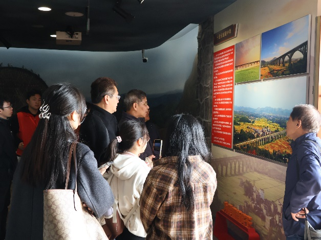 通過觀看實物資料、圖解、3D圖像以及聆聽解說、現(xiàn)場教學等形式,清晰的講述了渡槽的建造過程及原理。隨后趁熱打鐵,在渡槽旁展開專業(yè)教學,地學教師張樹岐給學生介紹該區(qū)地質(zhì)背景、巖溶地貌、巖性分析、渡槽及金銀河水庫的選址原則等知識;土木教師羅遠明給學生從水利基礎知識、水利工程施工技術、智慧水利管理等方面作專業(yè)講解,兩位老師深入淺出的講授,讓學生清楚明白工程建設不是一蹴而就的,要結合“地下”與“地上”多方面因素考量。