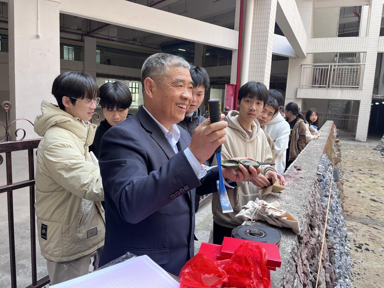 上課伊始,閻學(xué)欣教授帶領(lǐng)觀摩的教師、學(xué)生參觀“四探”實(shí)訓(xùn)場,介紹了地質(zhì)勘探中“四探”具體方法,即槽探、坑探、井探、鉆探在找礦中的運(yùn)用。在教學(xué)過程中,詳細(xì)講解了探槽編錄的目的、意義、方法及相關(guān)規(guī)范要求,他指出,精準(zhǔn)的探槽編錄能夠?yàn)楹罄m(xù)的地質(zhì)研究和工程建設(shè)提供關(guān)鍵依據(jù),任何一個細(xì)節(jié)的疏忽都可能影響到整體的判斷;隨后,閻教授在現(xiàn)場進(jìn)行了認(rèn)真、細(xì)致的操作示范,從探槽的測量定位、地質(zhì)現(xiàn)象的觀察描述,到繪制編錄圖的步驟與要點(diǎn),都一一進(jìn)行了演示,并強(qiáng)調(diào)了操作過程中的注意事項(xiàng)。