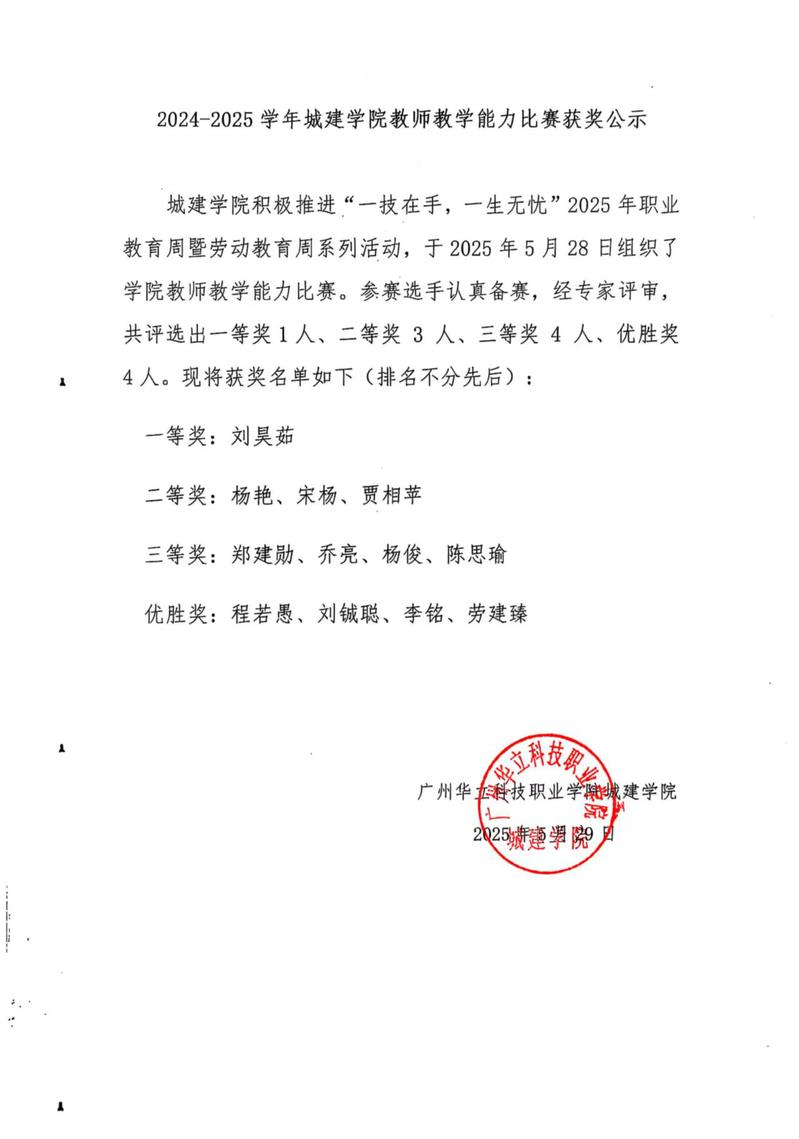 2024-2025學(xué)年城建學(xué)院教師教學(xué)能力比賽獲獎公示