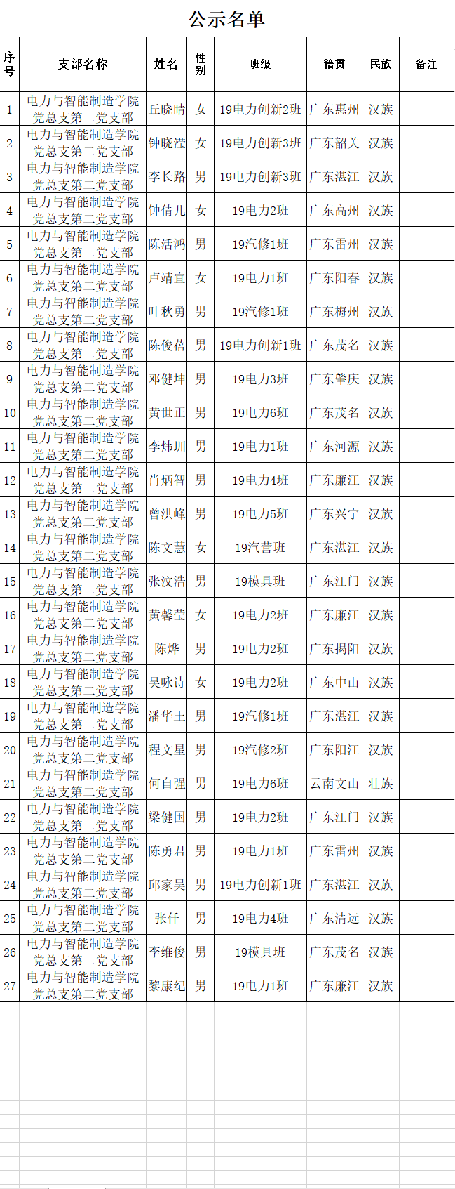 根據(jù)廣州華立科技職業(yè)學(xué)院黨委發(fā)展新黨員的要求,由學(xué)生本人提出申請,經(jīng)電力與智能制造學(xué)院黨總支第二黨支部培養(yǎng)考察、民主推薦,黨總支審查,2021年4月25日預(yù)審討論決定將陳燁等27位同志列為近期預(yù)備黨員發(fā)展對象,總支將在近期召開黨員大會討論他們的入黨問題并上報黨委審核。為了進一步增強發(fā)展黨員的透明度,確保發(fā)展新黨員的質(zhì)量,根據(jù)《中國共產(chǎn)黨發(fā)展黨員工作細(xì)則(試行)》等文件的有關(guān)精神,現(xiàn)將發(fā)展對象的名單公示如下(具體名單見附件):